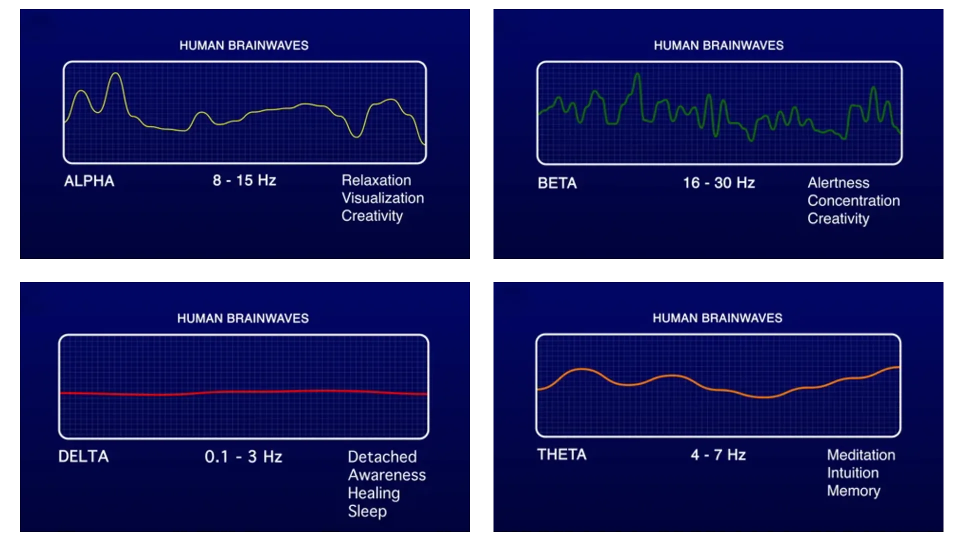- تتا (۴–۸ هرتز): رویاپردازی، مدیتیشن، و خلاقیت.